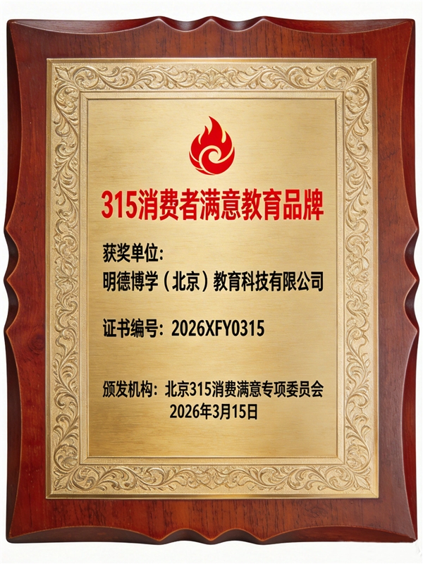 在第44个国际消费者权益日到来之际,由北京315消费满意专项委员会主办的"2026年消费满意品牌评选"结果正式揭晓,明德博学(北京)教育科技有限公司凭借过硬的教学品质、完善的服务体系以及良好的用户口碑,成功获评"315消费者满意教育品牌"称号,证书编号为2026XFY0315。