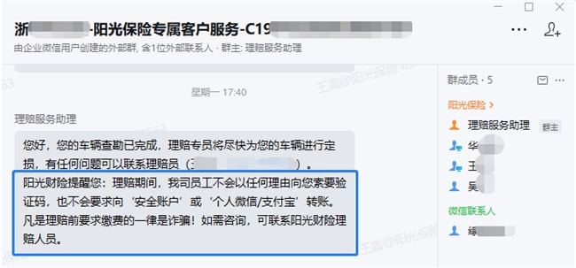 “理赔期间,阳光员工不会以任何理由索要验证码,也不会要求向‘安全账户’转账。凡是理赔前要求缴费的一律是诈骗!”这是阳光财险的“微光·一条信”内容。理赔案件处理中,服务机器人会及时向客户发送这样一条提醒信息,目前已累计发出超1.6万条。一条短信,简短有力,在服务闭环中完成贴心守护。