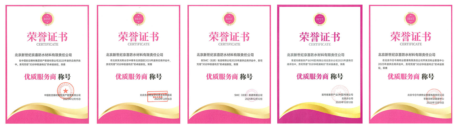 主动破解行业痛点、践行高效响应的背后,是京喜防水 33 年沉淀的扎实技术与硬核实力。作为国家高新技术企业,京喜防水拥有 150 多项已授权专利及商标,核心产品与施工技术优于行业标准,行业竞争力突出;连续四年斩获防水行业权威奖项 “金禹奖”,并斩获 “全国建筑建材行业优秀民营科技企业”“中央企业集采供应链百强企业” 等多项殊荣,专业实力得到行业与市场的双重认证。同时,京喜防水长期为中国中铁、中国铁建、中国能建等国家级龙头企业提供系统性防水解决方案,服务案例覆盖故宫博物院、大兴国际机场、无锡地铁等众多重点工程,以卓越的工程品质与响应能力,筑牢行业标杆形象。