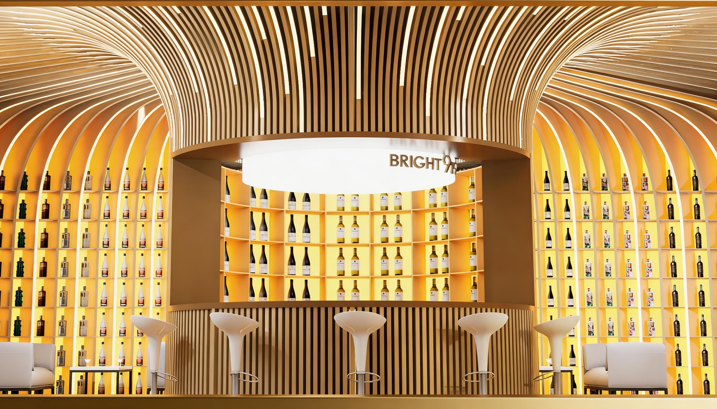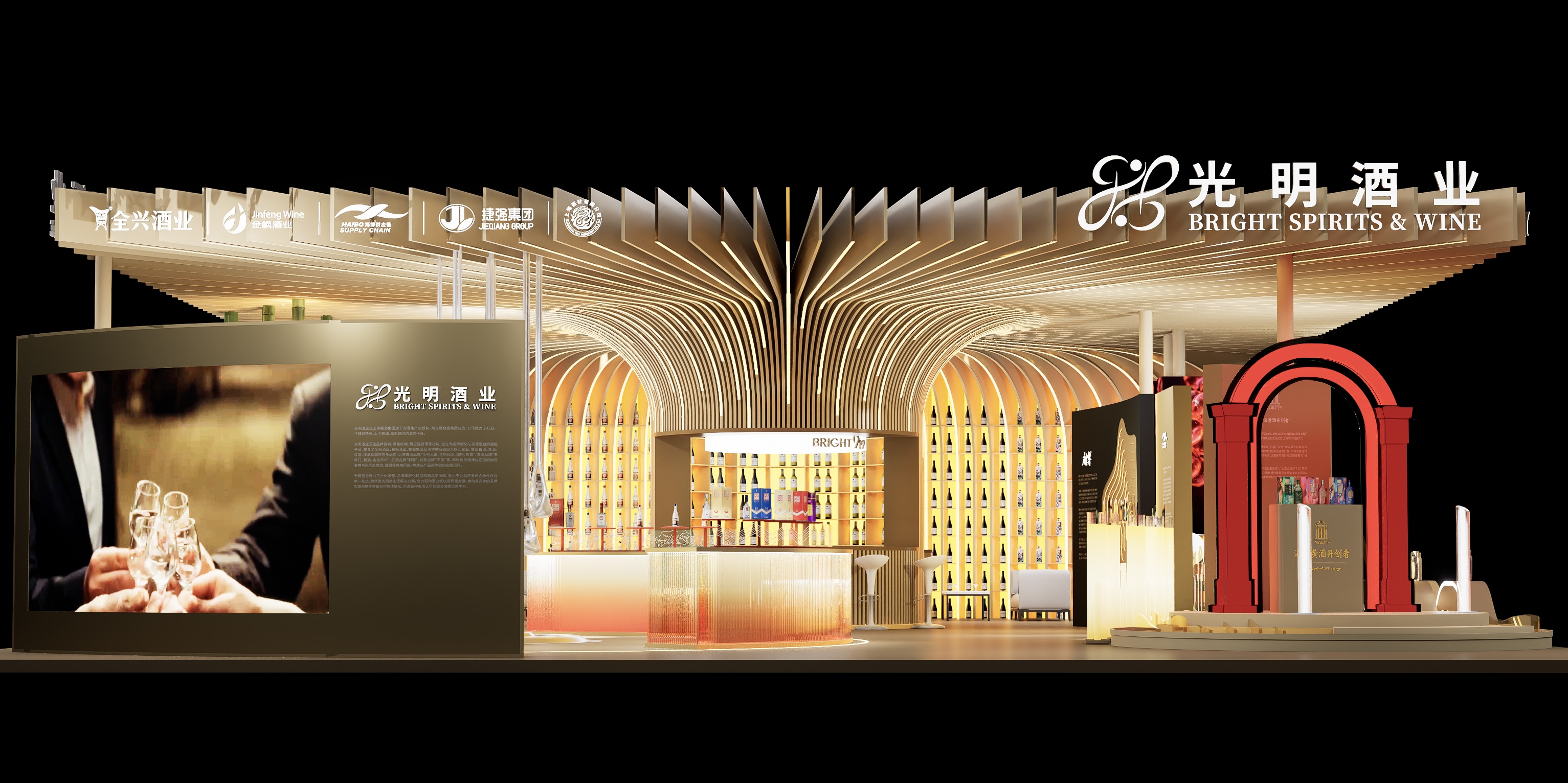 各品牌空间最终于展厅中心区域汇聚光能,打造出汇集全球美酒品类的光明玖壹玖试饮调酒区,整体呈现光明酒业各品牌沐光新生,各美其美的协同发展格局。