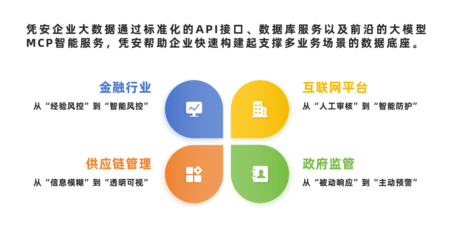 凭安能够为不同行业的客户提供“即插即用”的数据服务,无论是单一维度的信息核验,还是跨维度的综合画像,都能在快速响应中精准交付。赋能千行百业,快速构建多业务数据底座。凭安企业大数据库的价值,在于它能够被灵活封装,深度融入各行各业的业务流程,成为客户自身业务系统的有机组成部分。通过标准化的API接口、数据库服务以及前沿的大模型MCP智能服务,凭安帮助企业快速构建起支撑多业务场景的数据底座。
