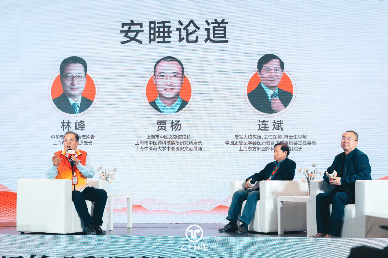 “安睡论道”环节中,在上海市药监局原处长、中华志愿者协会代表林峰的主持下,陆军大校主任医师、博士生导师连斌与上海市中医文献馆馆长贾杨分别围绕大会主题分享了见解与心得,一致强调睡眠管家对守护全民健康的重要价值。