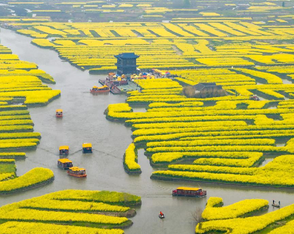 3 月下旬至 4 月中下旬,江苏兴化千垛水上油菜花盛放,独一无二的垛田地貌造就了国内唯一的水上油菜花海奇观,乘舟穿行其间,尽览江南水乡的灵动诗意。
