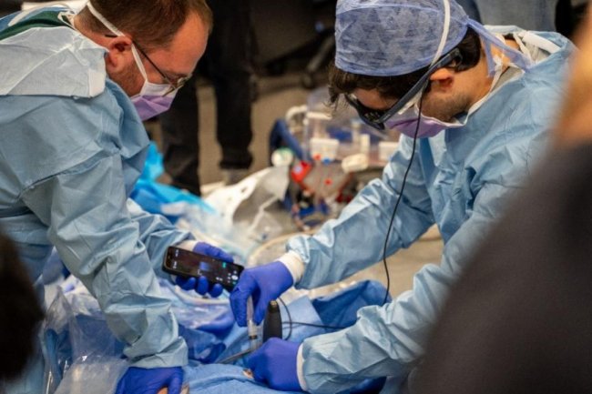 置管工作中,超声能实时、精确的显示出所需的血管成像内容,成为操作中的“导航仪”。Lamhaut教授指出:“凭借掌上超声和AR眼镜,我们可以在不改变操作位置的情况下,实时观察穿刺部位。这能提升操作的准确性。”