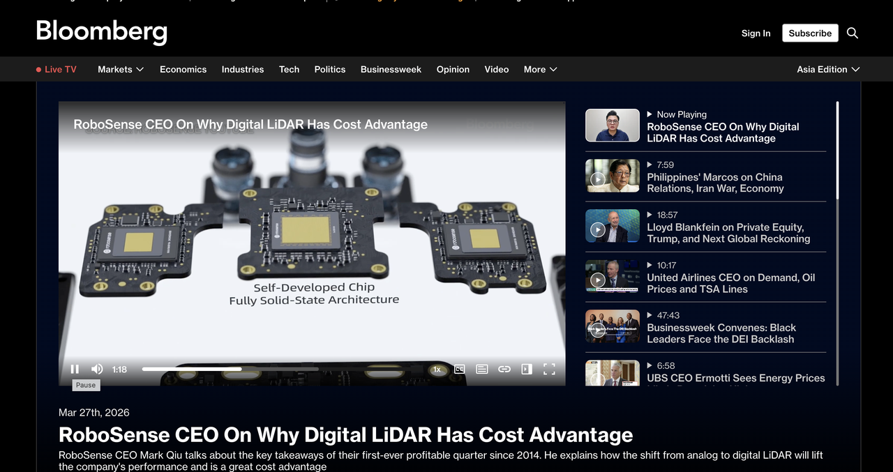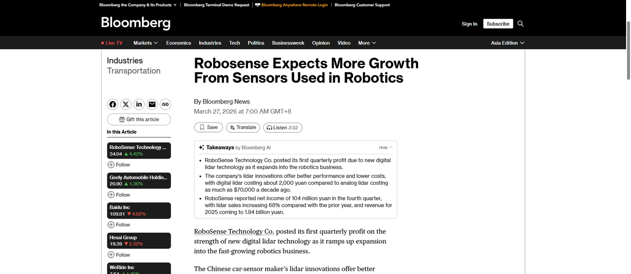 3月25日,速腾聚创发布2025年及Q4业绩报告,以1.04亿元净利润,大超市场预期,实现公司历史上的首次单季度盈利。超预期业绩表现吸引来自彭博社、华尔街日报、Benzinga等多家国际头部财经媒体的集中报道。通过对公司CEO的专访,海外媒体展现出对速腾聚创技术代差实力、机器人业务爆发、创新机器人产品进展等话题的高度关注,反映出国际资本正重新评估速腾聚创的业务及成长逻辑。