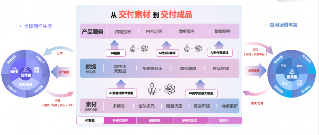 作为中国领先的视觉内容智能服务平台,公司核心资产为超过7亿的高质量、版权合规的多模态数据,涵盖图片、视频、音乐及3D等内容。基于自研的图像理解大模型,公司将原始内容素材进行多维结构化数据标注,转化为具备版权可溯源、结构化优势的核心数据资产。此外,公司还积累了近十亿次的用户行为数据、创作者社区行为数据,以及媒体出版、广告营销、创意设计等垂类行业知识图谱,构成发展人工智能技术的重要基石。