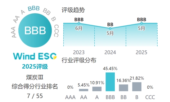 行业独占鳌头,领跑能源赛道。国证指数2025年第三季度ESG评级显示,美锦能源获评A级,在申万一级煤炭行业5家上市公司中排名第1,超越电投能源、冀中能源、山西焦煤等同行。两大国内权威指数机构均给予行业领先评价,充分说明美锦能源在ESG领域的实践,已成为国内能源企业绿色发展的标杆样本。