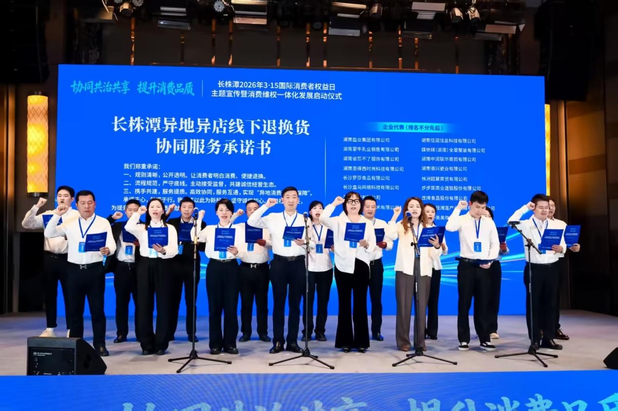长沙佳兴世尊酒店,长株潭2026年“3·15”国际消费者权益日主题宣传暨消费维权一体化发展启动仪式在此举行。湖南省市场监督管理局党组成员、副局长向延华出席活动并讲话。当长沙、株洲、湘潭三地市场监管部门共同签署《消费维权一体化合作框架协议》时,湖南盐业集团及雪天盐业公司代表与全省重点代表企业负责人一同登台,宣读《长株潭异地异店线下退换货承诺书》。