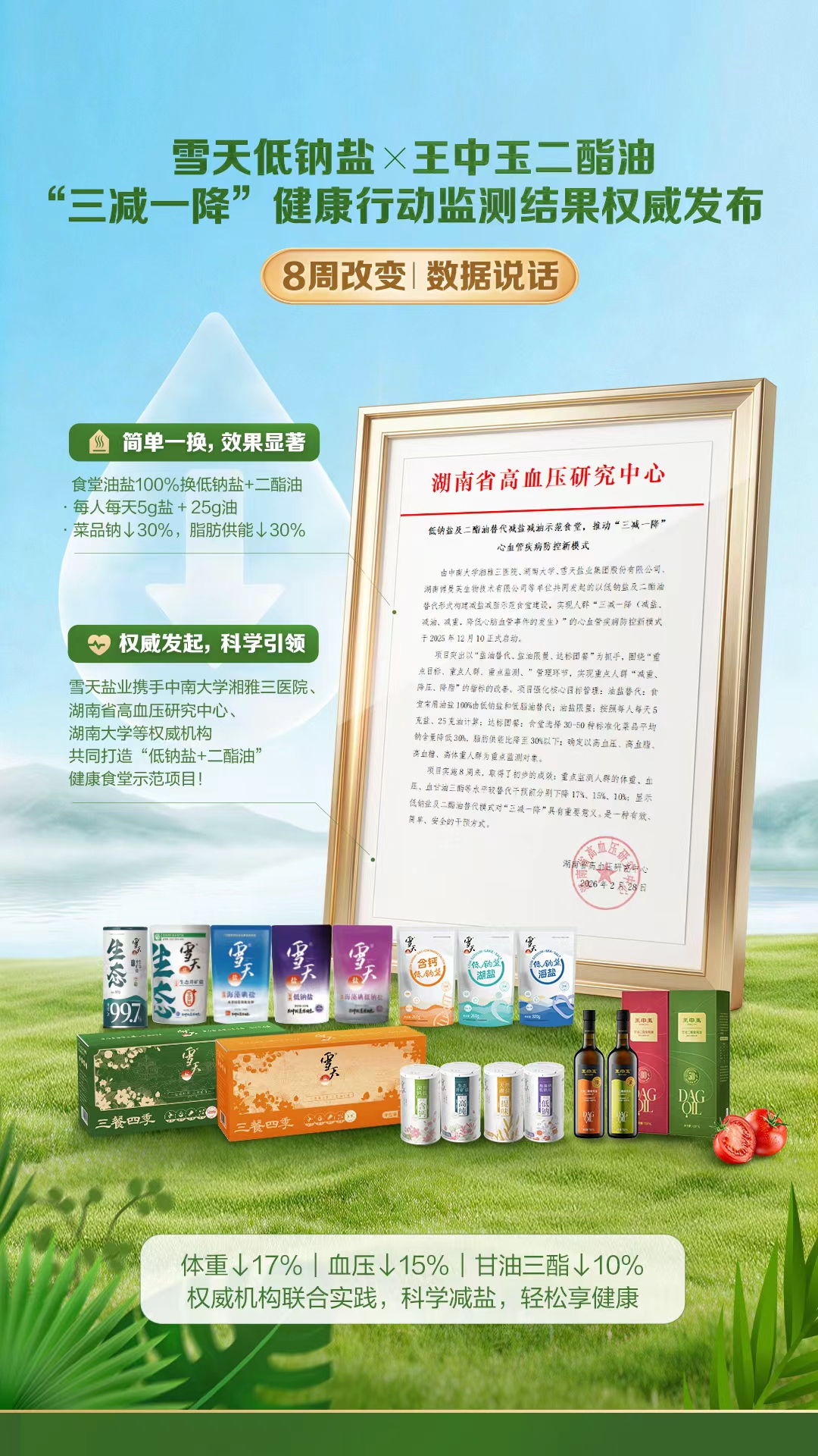 由湖南省高血压研究中心牵头,湘雅三医院、湖南大学等机构与雪天盐业、博曼芙联合发起的“盐油替代”项目——“三减一降”健康行动监测结果引人关注:使用雪天低钠盐、王中玉二酯油,在8周干预中实现参与者体重平均下降17%、血压下降15%、甘油三酯下降10%的显著成效。其中,“低钠盐+二酯油”组合,在食堂场景中实现菜品钠含量降低30%、脂肪供能比降低30%的目标。