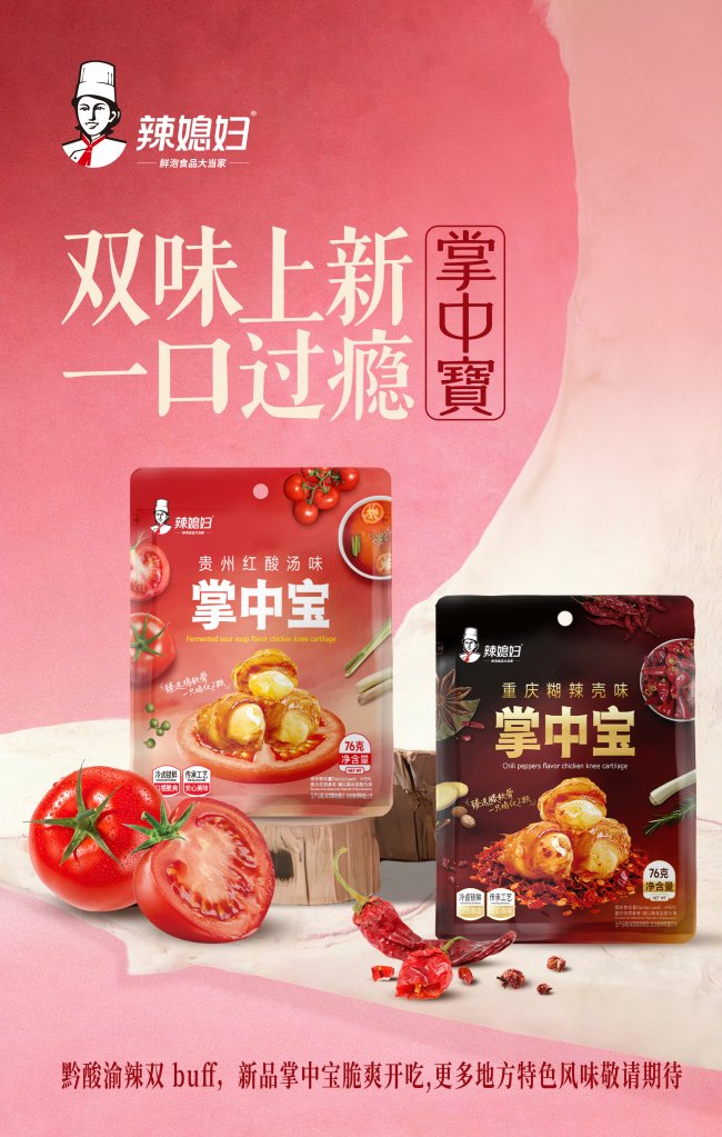 近日,国内知名休闲食品品牌辣媳妇食品正式推出新品——76g红酸汤味&糊辣壳味掌中宝,以“原料稀缺、工艺锁鲜、场景便携、品类创新”为核心优势,瞄准休闲鸡肉零食赛道,为消费者带来兼具地域风味与品质口感的全新选择。