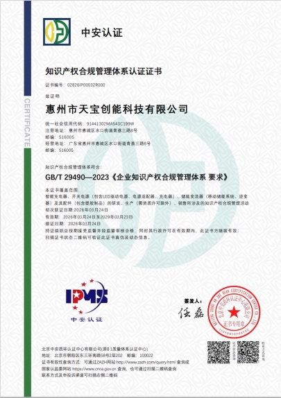 近日,惠州市天宝创能科技有限公司顺利通过GB/T 29490-2023《企业知识产权合规管理体系要求》权威认证,标志着公司知识产权创造、运用、保护、管理全流程迈入标准化、规范化新阶段。