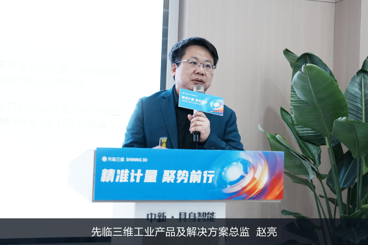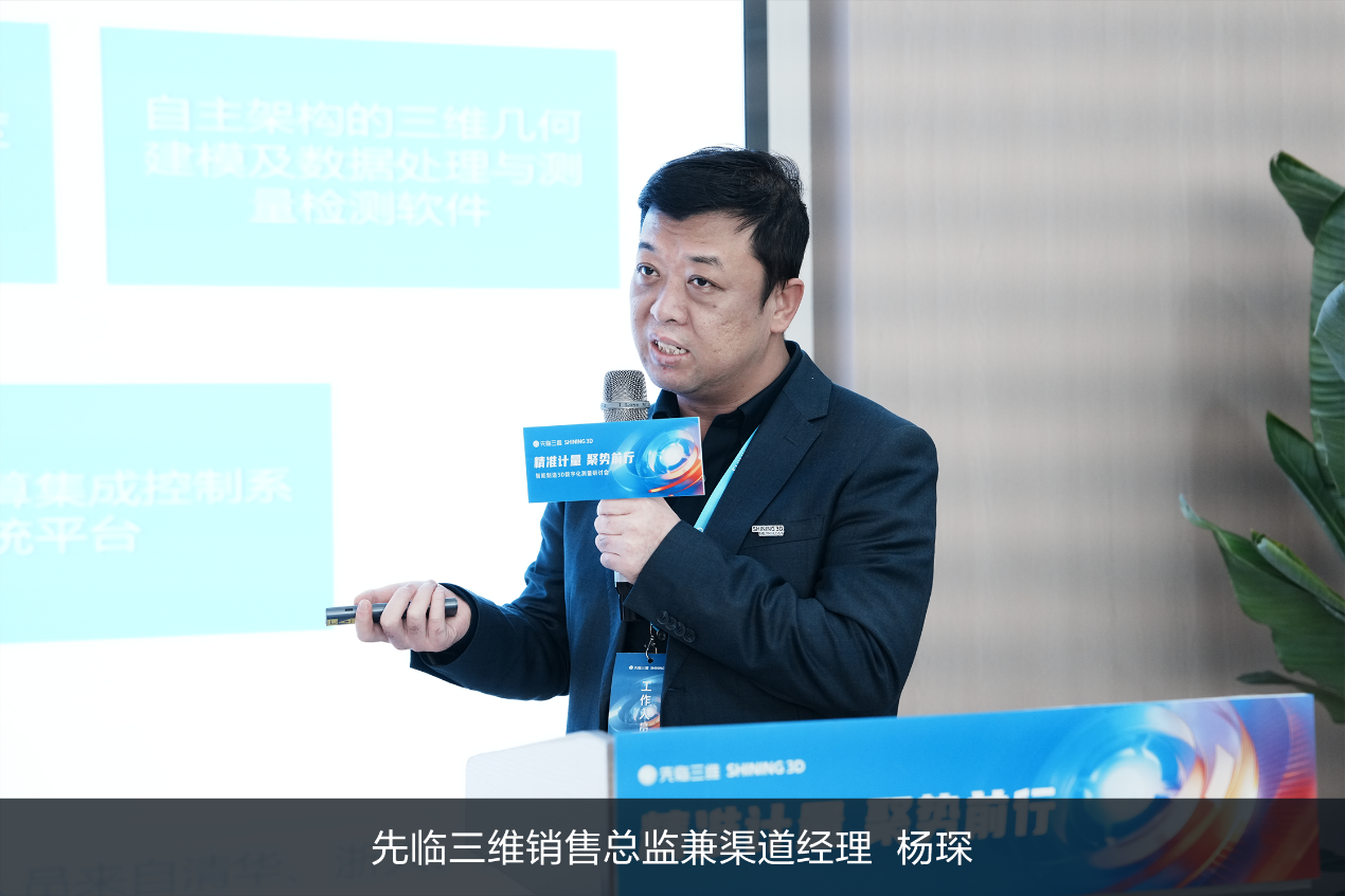 揭牌仪式之后,精彩纷呈的主题分享环节正式开启。先临三维销售总监兼渠道经理杨琛率先登台,回顾了公司深耕高精度工业三维扫描测量领域20年的发展历程,详细阐述了公司在技术创新、产品研发与服务升级方面的战略蓝图,并在现场重点推介了先临天远最新工业测量产品方案,其中包括无线一体式手持3D扫描仪、双光源手持3D扫描仪、手持式激光三维扫描仪、跟踪式激光三维扫描系统、固定式蓝光三维扫描仪、自动化智能三维检测系统等,展现了公司在高精度工业3D扫描领域深厚的技术积淀与持续引领产品创新的强劲实力。