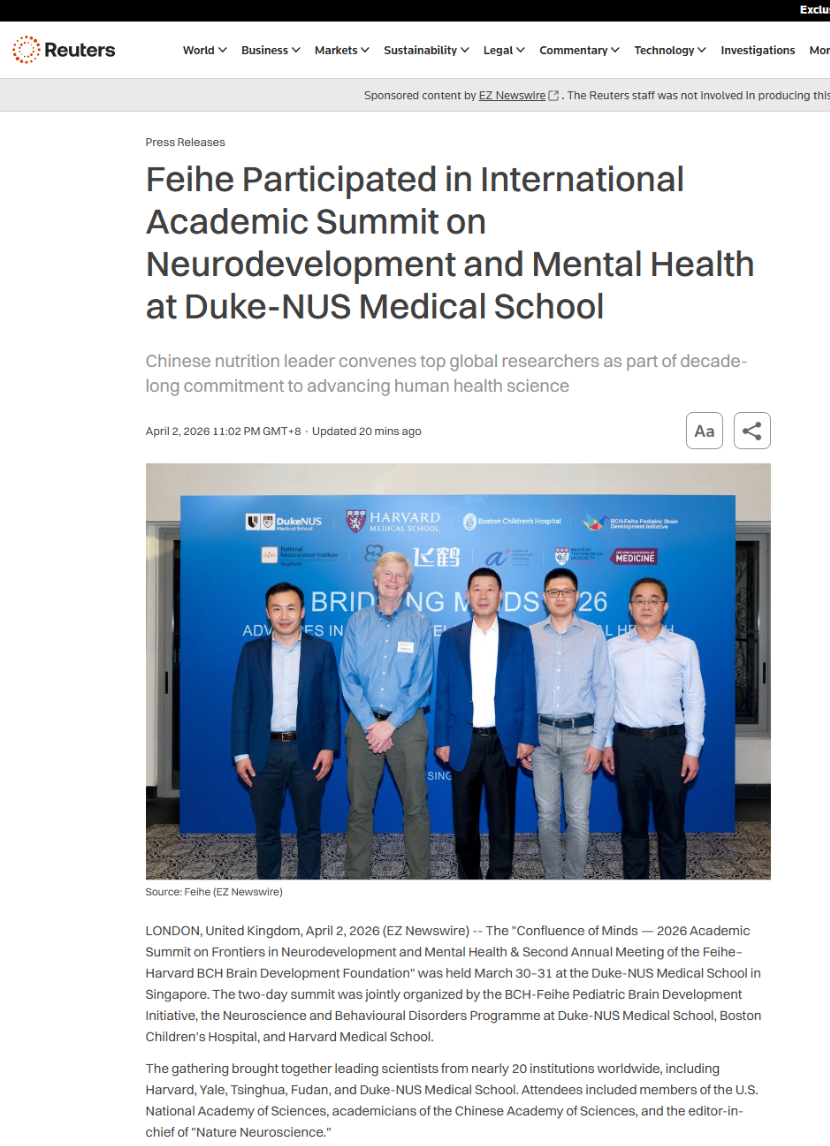 从物理AI领域的无人驾驶规模化运营,到通用人形机器人在春晚展示,再到生命健康领域的纵深突破,随着中国企业在各个产业领域接连交出“中国方案”,“世界向东看”正成为2026年国际舆论场的热门表述。近日,英国《路透社》、美国《时代周刊》等全球主流媒体刊发评论,聚焦3月底在新加坡举行的神经发育与精神健康前沿学术峰会,特别指出中国乳企飞鹤作为唯一企业方现身,其全球科研“连接者”的角色成为关注焦点。