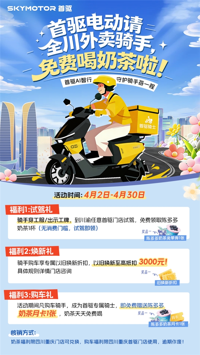 3.长期陪伴的“购车礼”:活动期间购车的骑手,在成为“首驱专属骑士”的同时,将获赠陈多多奶茶月卡一张,享受“奶茶天天免费喝”的持续福利。此举将一次性的购车行为,延伸为为期一个月的温情陪伴,在提供高效出行工具的同时,也关怀骑手奔波中的生活细节。
