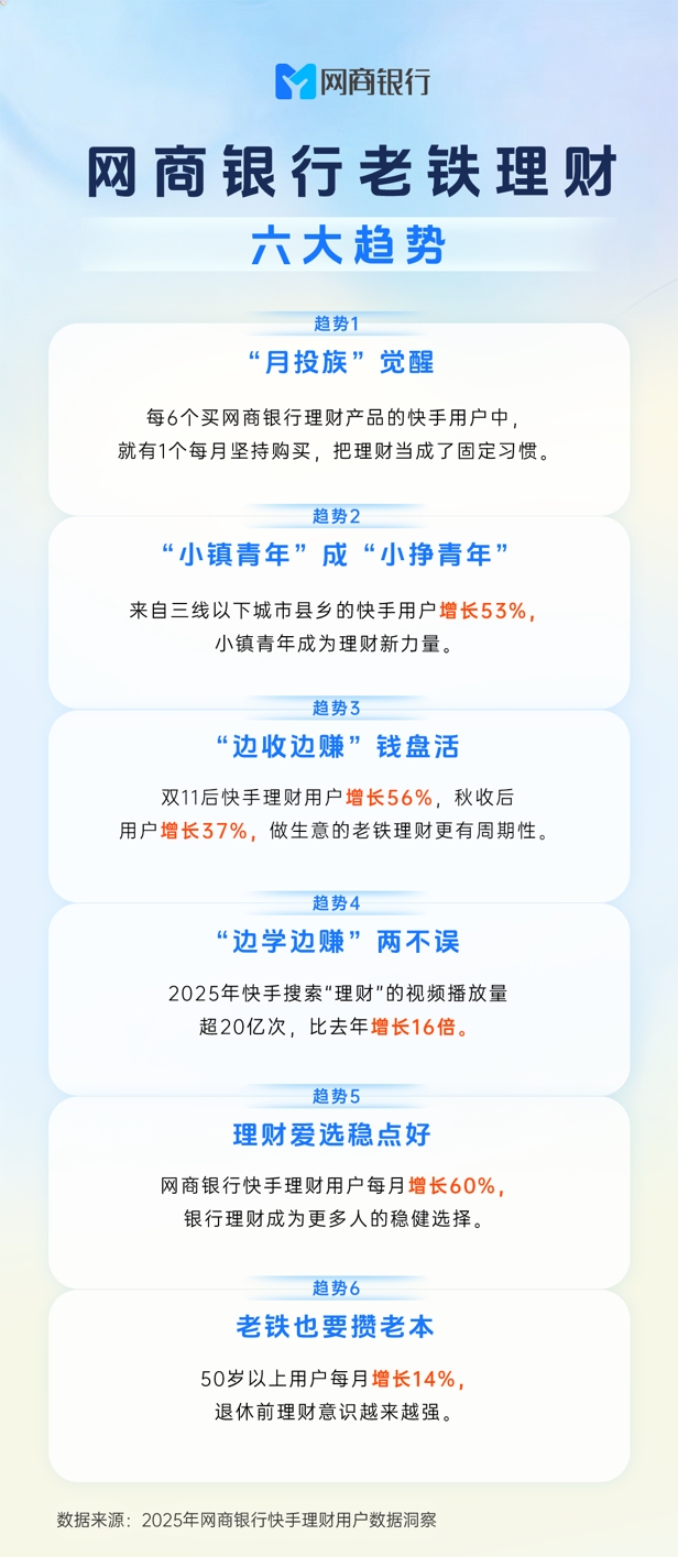 报告指出,每6个购买网商银行理财的快手用户中,就有1个养成了每月坚持购买的习惯,成为“月投族”。同时,“先学习、后理财”成为新风尚。2025年,快手平台“理财”相关视频的播放量超过20亿次,同比增长高达16倍,显示出用户在决策前主动学习、理性判断的成熟心态。