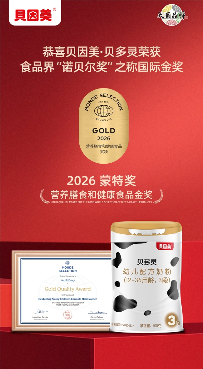 喜讯! 近日,素有食品界“诺贝尔”之称的国际蒙特奖2026年度评选结果重磅揭晓,贝因美贝多灵 A2凭借卓越品质、科学配方与严苛品控,从全球 90 多个国家、3000余款参评产品中脱颖而出,成功斩获蒙特奖金奖。这一国际权威奖项的加冕,是对贝因美贝多灵A2 产品力的最高认可。