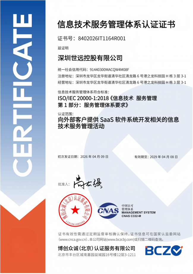 对于企业级SaaS产品而言,服务管理体系的标准化,直接决定了产品的交付质量与客户的长期使用体验。世远控股始终以客户价值为核心,将ISO20000标准深度融入产品研发与服务全流程,通过规范服务流程、明确服务责任、优化服务效率,为客户打造“可信赖、可追溯、可迭代”的SaaS服务体验,本次认证正是公司长期坚持标准化、规范化运营的重要成果。