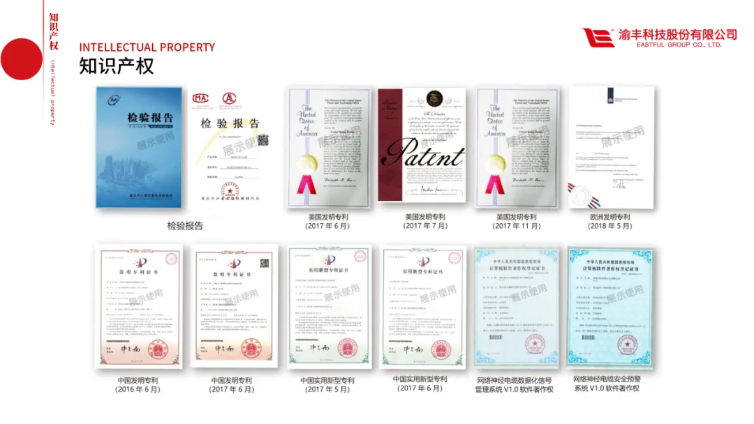 渝丰始终将科技创新置于企业发展的核心战略位置,不仅建有“一院两站六中心”、CNAS实验室、核级电缆先进技术实验室,还与国内多所知名高校及科研院所建立紧密的产学研合作关系。公司已获国内外授权专利74项,荣获欧洲RoHS认证、IATF16949认证、美国和加拿大UL认证、德国TÜV认证、ABS美国船级社认证、RINA意大利船级社认证、LR英国劳氏船级社认证、DNV挪威船级社认证、BV法国船级社认证、KR韩国船级社认证、NK日本船级社认证、CCS中国船级社认证等。公司拥有专业化、系列化、规模化、成套化的产品族群,可专业生产包括拥有完全知识产权的网络神经电缆、百年长寿命电线、轨道交通电缆、矿物绝缘防火电缆、光伏发电用电缆、舰船用电线电缆、风力发电电缆等在内的民用级、工业级和特种电缆产品群。