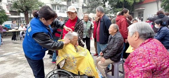 活动中,最动人的一幕定格在公益理发摊位前。辖区 99 岁高龄的李奶奶在家人陪同下前来参与活动,社区党委书记尹同财贴心为老人优先安排理发,并全程暖心陪同。理发志愿者俯身弯腰,轻柔梳理发丝,细致询问发型需求,动作温柔舒缓、细致入微。理发间隙,志愿者耐心与老人唠家常、暖心交流,舒缓老人情绪,现场温情满满、暖意融融,尽显敬老爱老的温情与温度。