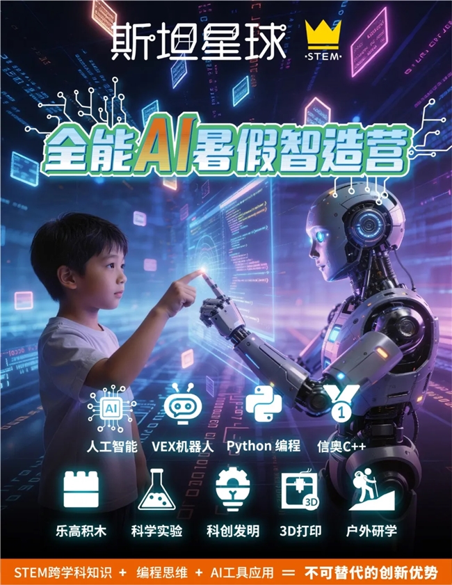 为响应国家科技人才培养号召,斯坦星球正式推出2026全能AI暑假智造营,面向小班至高中全年龄段,打造覆盖编程、机器人、3D打印、科创竞赛、等级考试、研学营地的一站式AI科创成长平台,助力青少年从AI使用者成长为创造者。