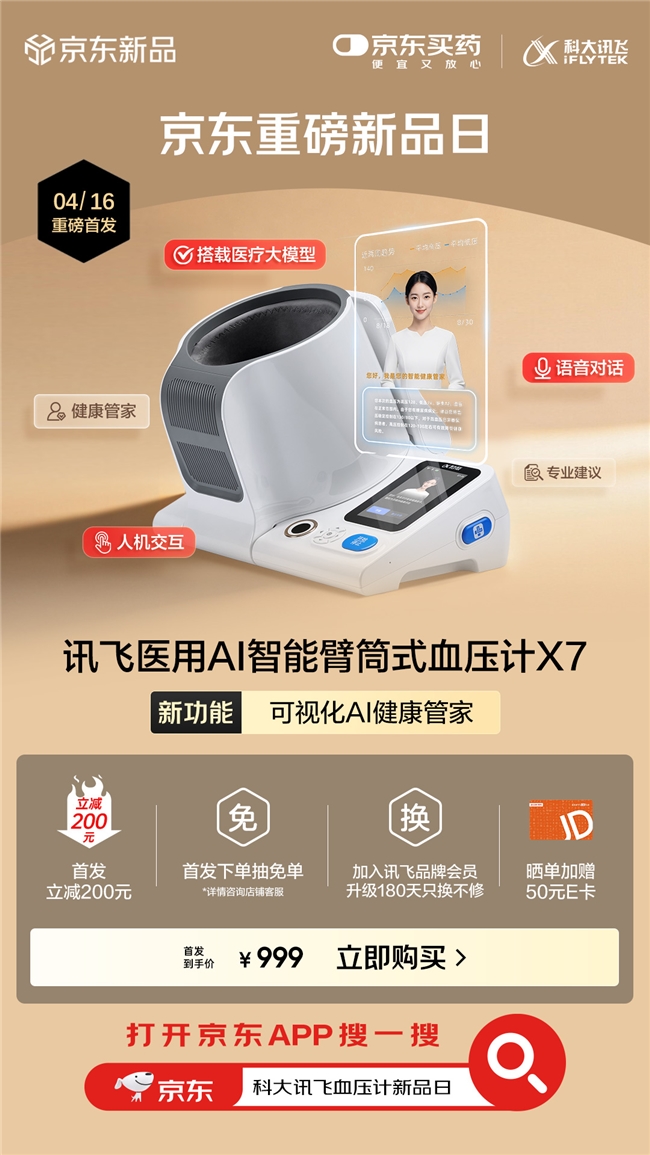 4月16日晚8点,讯飞智能臂筒式血压计X7在京东健康全渠道独家首发,标志着“AI+医疗器械”战略在慢病健康管理领域的加速落地。这款智能血压计新品,深度融合了医疗AI大模型与院级精准测量技术,为用户带来“测得准、能对话、会分析”的居家血压健康管理新体验。即日起,打开京东APP搜索“科大讯飞血压计新品日”,即可直达页面。