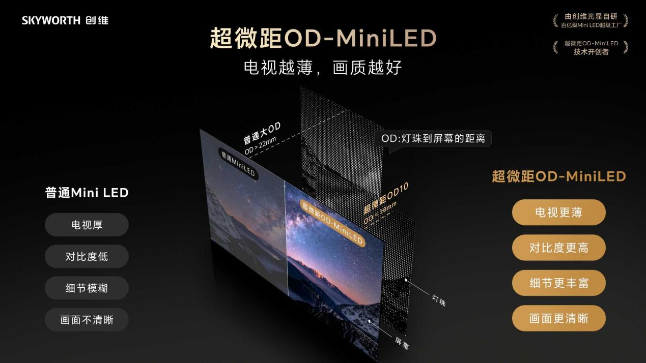 长久以来,电视厂商始终存在着一个“OD困局”,想要让光线均匀混合,OD就不能做得太小;想要做小OD提升画质,就必须先突破混光和散热难题。受限于技术难题,市面上的电视普遍采用15mm~22mm的普通OD方案,创维则基于OD≦10mm的「超微距OD」技术,实现了亮度和光晕控制的双重升级,成就创维壁纸电视产品行业领先的画质体验。