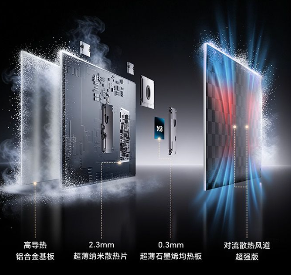 散热材料方面,创维采用了仅2.3mm的超薄纳米散热片,其借助微结构与高导热纳米材料,确保在有限空间内也能提供持续稳定的高效散热能力,散热面积增大25%;0.3mm超薄石墨烯均热板覆盖主芯片,可以实现横向快速导热,从而使温度降低约5度。
