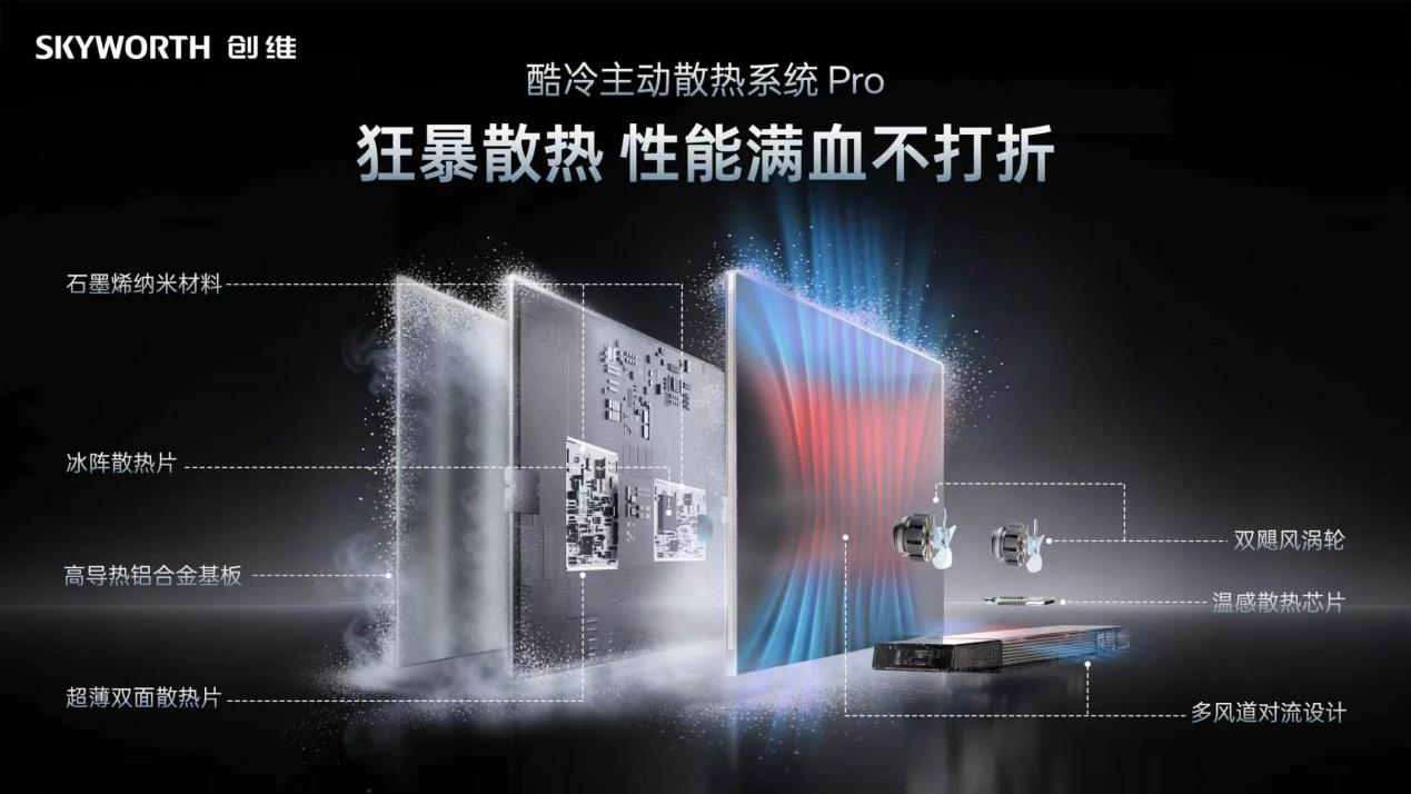 除光学系统外,小OD下的散热系统也需要重新设计。传统大OD电视内部冗余的散热空间足够,电视工作时所产生的热量可以及时散出,而小OD下的散热空间被压缩,容易带来热量堆积,轻则缩短背光灯珠寿命,重则影响面板的整体可靠性。为此,创维全面革新了散热材料和散热结构,用搭载了418项超薄散热专利技术的「酷冷散热系统」,补齐了超微距OD技术落地的“最后一块拼图”。重点来看: