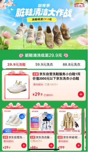 4月10日起,消费者在京东下单洗鞋服务,参加活动会场分享活动,通过小红书、抖音、快手等平台发布体验洗鞋服务等相关笔记,可瓜分京豆激励。