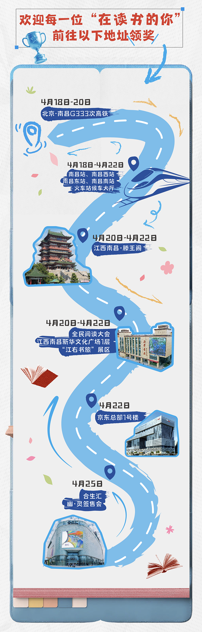从京津城际延伸至长途旅途,4月18日至20日,北京-南昌G333次高铁将变身为第五届全民阅读大会的“书香专列”。列车上开展知识问答互动,工作人员以长征历史、铁路知识、全民阅读常识等内容组织有奖问答,参与互动的旅客可获得内含图书、纪念票根、书签、冰箱贴的“书香福袋”。列车还提供图书借阅服务,让旅客在旅途中随时享受阅读的乐趣。
