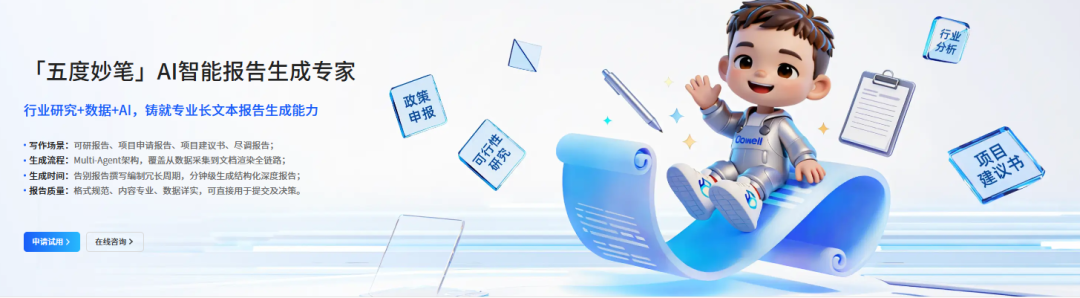 基于Multi-Agent 架构打造的专业长文本报告生成引擎,五度妙笔以依托"行业研究 + 数据 + AI" 三位一体的技术特点,重新定义专业长文本报告生成方式。彻底解决了通用大模型在专业报告领域 "深度不足、数据不准、格式不规范" 的行业难题。