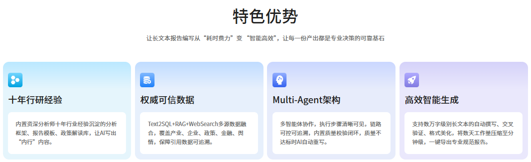 突破传统单模型生成的局限性,采用多智能体分工协作模式,构建从需求分析→数据采集→逻辑建模→内容撰写→交叉校验→文档渲染的完整闭环。各智能体独立执行专项任务,生成过程全链路可追溯,实现高复杂度、强逻辑长文本的稳定输出。