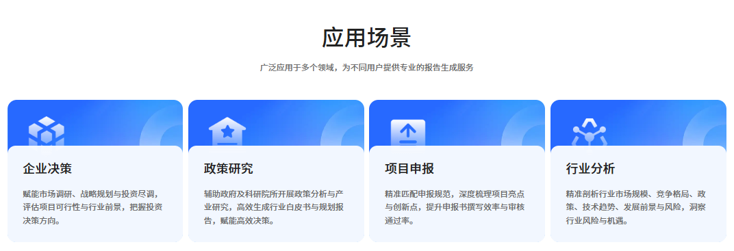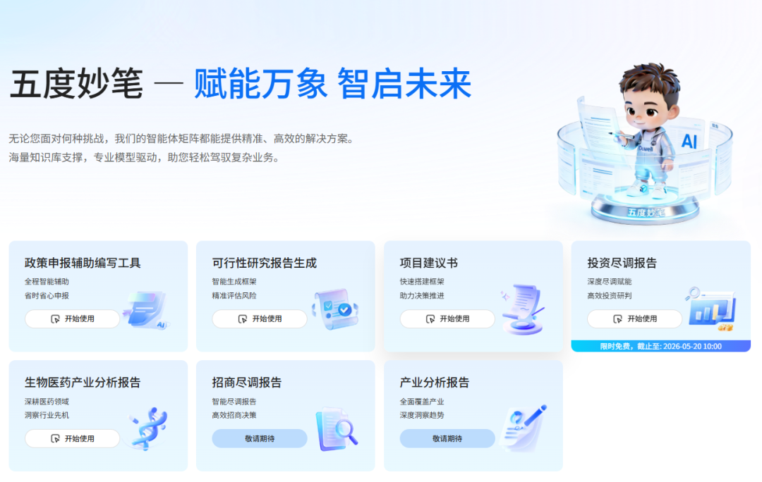 目前,五度妙笔已覆盖多种核心业务场景,支持政府申报辅助编写、可行性研究报告、项目建议书、投资尽调报告、生物医药产业分析报告等多种报告类型的智能生成。系统将传统数天的报告撰写周期压缩至分钟级,把重复劳动交给引擎,把决策判断留给自己——你不再是文字的搬运工,而是决策的定调者。