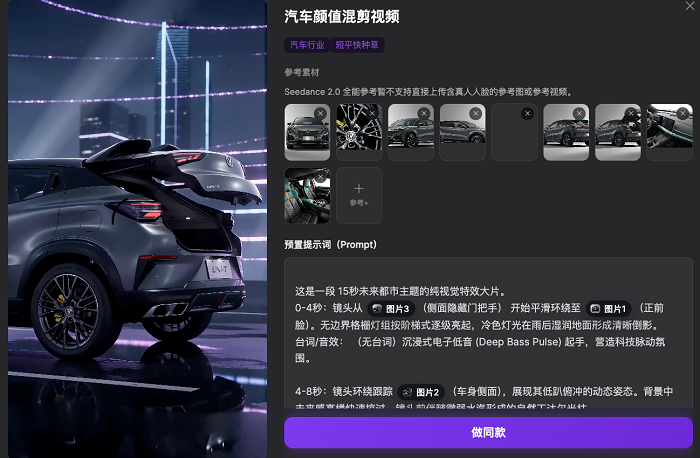 模板生成:内置100 + 汽车行业专属模板(新车发布、性能测评、优惠促销、试驾 vlog 等),选择模板替换车型信息,即时生成成品视频。
