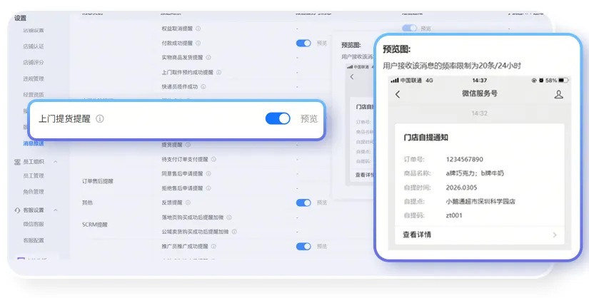 门店自提订单场景中,商品到店后通知渠道不完善,易出现用户获知信息不及时、商品损耗、售后纠纷等情况。本次小鹅通上线微信服务号自动到货提醒功能,同时支持门店端手动单条或批量发送提醒,可精准触达用户告知取货信息。该功能可适配多元配送场景,优化订单履约流程,提升自提订单运营效率与用户消费体验。
