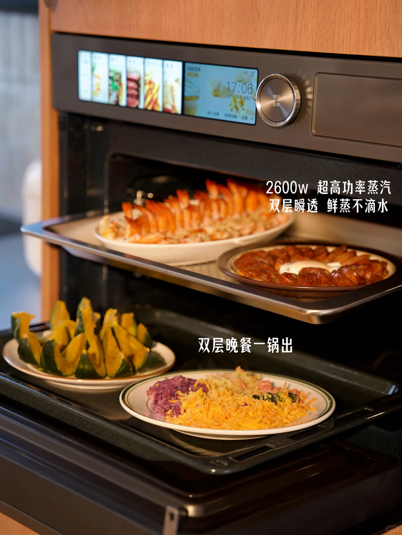 其一,蒸汽穿透力强,食材口感更理想。360°瞬透蒸汽可快速且均匀地作用于食材,蒸制面点蓬松饱满、形态完整;蒸制肉食与海鲜鲜嫩多汁,风味纯粹,多层同步蒸制也能保持上下层口感一致、熟度均匀,满足家庭多样化蒸制需求。