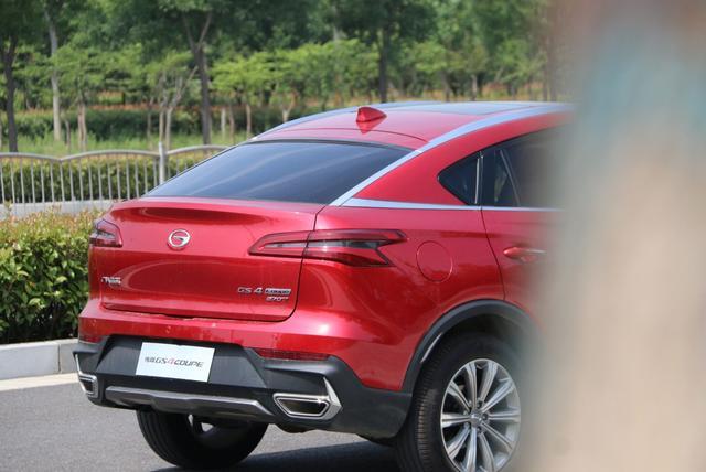 当然,对于一款跨界SUV而言,最好的观赏点还应该在后侧45°角处。不同于部分同级车型生硬地将"溜背"设计融入至SUV车身上,传祺GS4 COUPE的尾部显然经过了精心设计,车顶在经过B柱后缓缓下沉,给人一种舒展的感觉,而车窗周围的银色镀铬条,更增强了设计的整体感。再加上后备箱处微微翘起的"鸭尾",不仅令车辆获得更为优异的空气动力学性能,还增加了一丝俏皮的感觉,堪称"斩男款"。