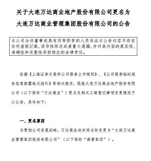 万达商业正式更名为万达商管集团 不再进行房地产开发