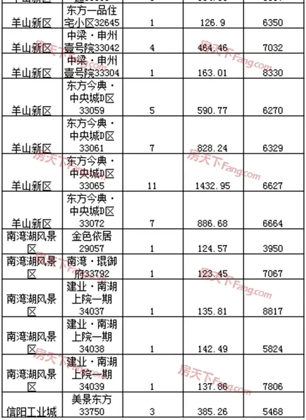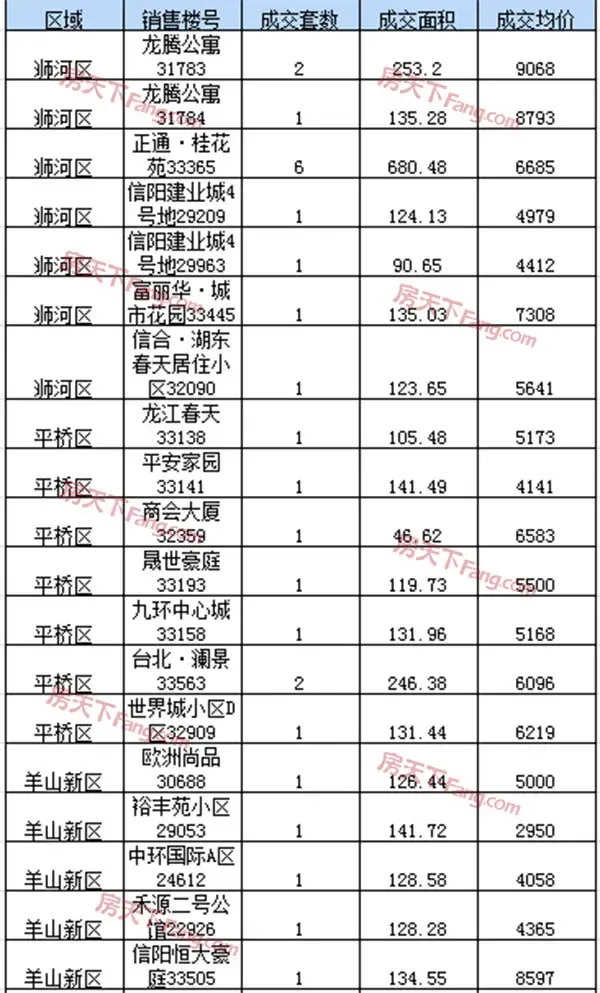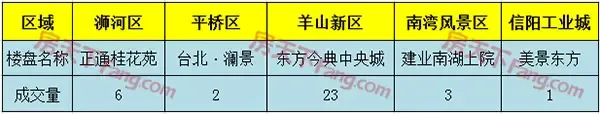 从上面详细成交列表上来看,各区域成交榜首分别为:浉河区正通桂花苑成交6套;平桥区台北·澜景成交2套;羊山新区东方今典中央城成交23套,南湾湖风景区建业南湖上院成交3套,信阳工业城美景东方成交1套。