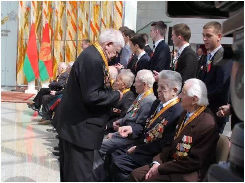 当地时间上午11时20分许,习近平主席与卢卡申科总统步入纪念大厅,老战士们纷纷起立,报以最热烈的掌声。随后,他们依次缓步上前,接受习主席颁发纪念奖章。很多老战士还未等念到自己的名字,便提前站起来等候,看得出来,他们心中也是很不平静啊。