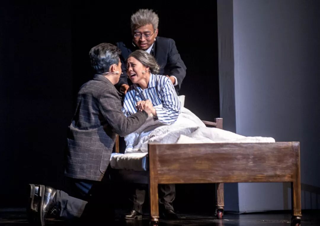 话剧《马兰花开》中,邓稼先(左)在原子弹研制成功后回家探望生病的父母。新华社记者 张宇 摄