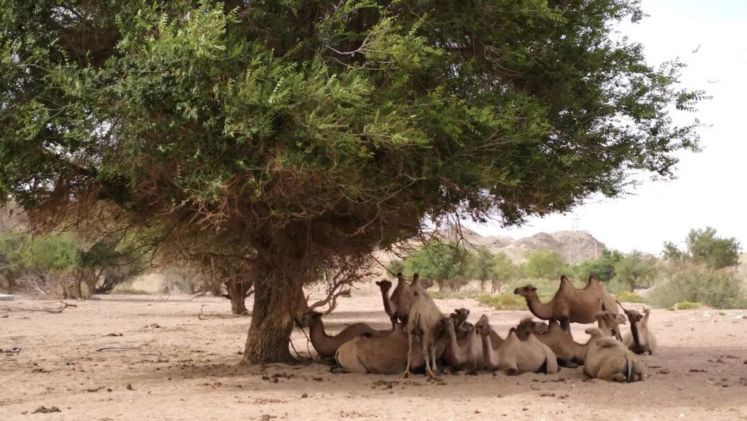 突然出现一峰骆驼,挡在车前,瞪大眼睛看着我们坐的这个铁怪物,远处更多的骆驼在树荫下观望。但树,却只有一色的榆树。在戈壁这种“夏日如烧,冬风如刀”的大环境下,能够存活的大乔木只有榆树。这时连大名鼎鼎的胡杨也不见了踪影,更不用说所谓“岁寒而后凋”的松柏了。大漠最可怕的不是寒,而是干。要窒息生命,干涸比寒冷更彻底。