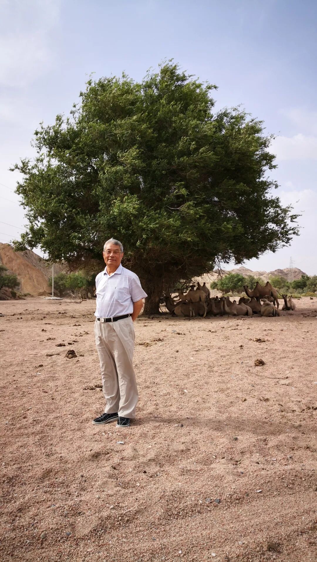 “风打沙埋流云过,独向苍天不问年。闲看天边蘑菇云,静听落叶打脚面。”这是一棵很老、很有资格的老榆树,它独立在宽阔的河滩上,背景是远山的红色岩石,脚下是灰色的戈壁砂粒,不远处几只悠闲的骆驼在吃草。