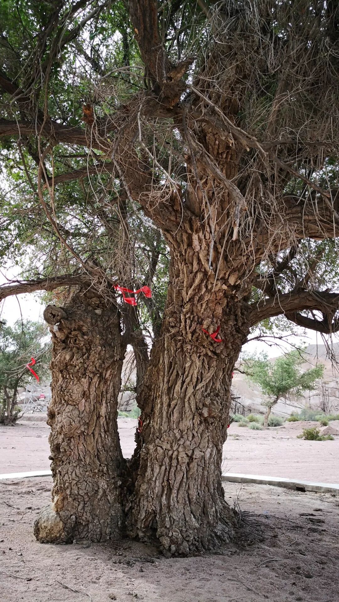 想不到戈壁滩上一棵普通的榆树却出了大名。我正苦于在边疆地区找不到有故事的人文古树,新疆的一位朋友突然来电话说,他们那里有一棵老榆树,与我国的第一颗原子弹爆炸试验有关,被当年领导核试验工程的张爱萍将军命名为“夫妻树”。我听后大喜,放下电话,稍加准备便飞往现场,这次找树真可以说是不远万里了。