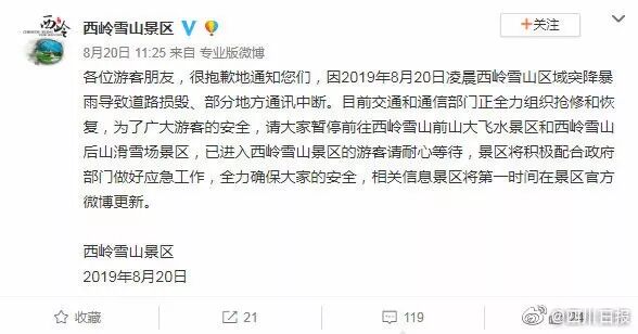 20日,西岭雪山景区突降暴雨,导致道路损毁、部分地方通讯中断,景区内外都有游客滞留。