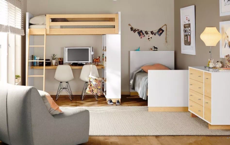 休息、学习、玩耍、收纳这4大功能是肯定要有的。学习功能在学龄前可以做日常互动,学龄后使用频率更多,是一定不能少的。怎样设计比较好呢?