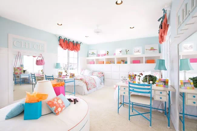 双人儿童房设计就更加有爱了,东西都是两两一套,床可以是上下或者左右布置,学习也是两张桌椅并排,看着都好有氛围。