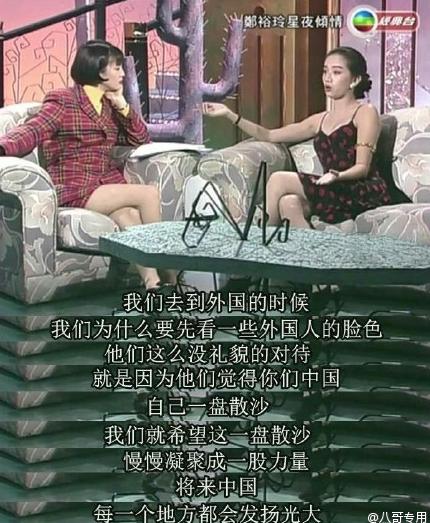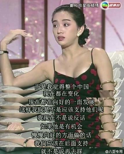 19日下午,知名博主“八哥专用”在其微博上发出梅艳芳曾接受采访的话:“20多年前,梅艳芳接受采访时说:我觉得现在中国在向一个好的方向发展,我觉得我们(香港)应该在背后支持,我们是中国人,我们不要内部乱乱的,这样外国人更不会尊重我们,我们要集聚起来,将来中国每个地方都会发扬光大。”