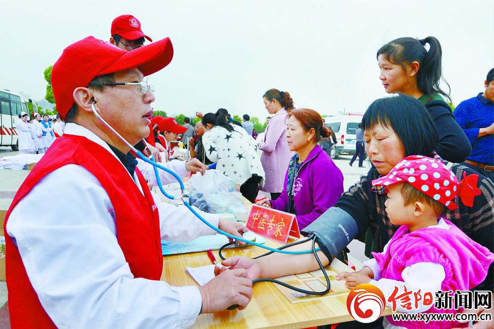 为减轻困难群众医疗负担,发挥卫生计生行业优势,助推健康扶贫工作,4月25日,罗山县启动“百村义诊下基层 卫生扶贫进农家”义诊活动,组织全县医疗骨干成立27支服务队,分赴各贫困村开展巡回义诊服务。图为义诊活动现场。本报记者 陈世军 摄