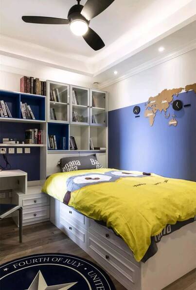 儿童房墙面以世界地图的造型墙饰,床头后方则是一个书架,整个床也是实用的收纳,搭配一套小黄人床单,整个空间都显得活力自然。